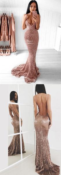 2018 Sexy Rose Gold Prom Dress, Long Sexy Deep V Neck Backless Fashion New Arrival Sleeveless Prom Dress