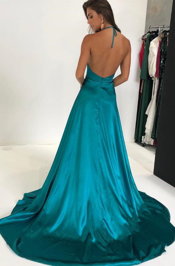 2018 Sexy Teal Prom Dress,Halter Deep V-Neck Prom Dress,Backless Prom Dress,Long Prom Dress Evening Dresses