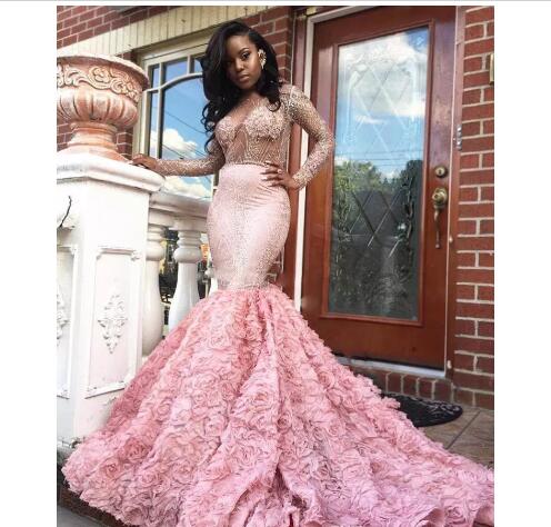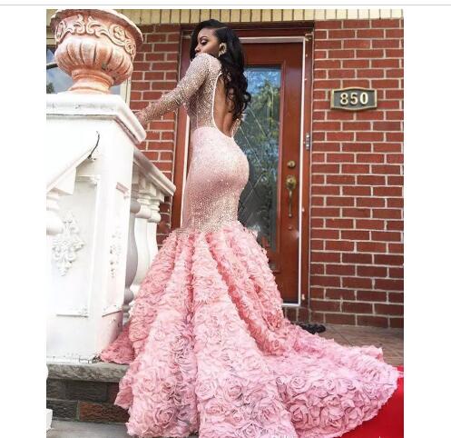 2018 Gorgeous Black Girl Prom Dress Pink Long Sleeve Prom Dresses Sexy See Through Long Sleeves Open Back Mermaid Evening Gowns Formal Party Dress