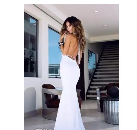 Sexy Backless White Dresses Sleeveless Elastic Satin Sweep Train Halter With Evening Prom Cocktail Party Dresses