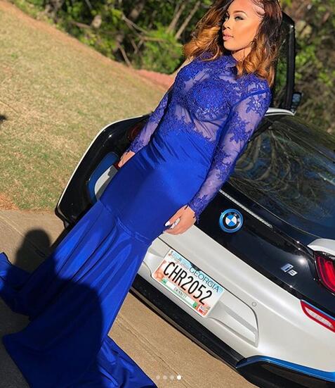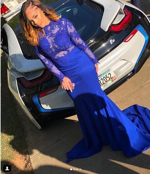 Royal Blue Mermaid Prom Dresses African Black Girl Gorgeous Evening Gowns Sheer Long Sleeve Lace Party Gowns