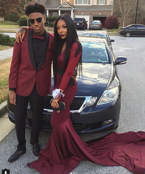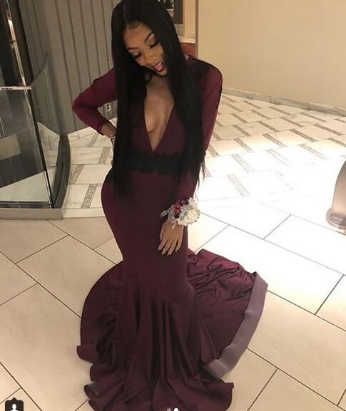 Sexy Wine Red Burgundy Deep V Neck Prom Dresses Appliques Long Sleeve African Girl Black Girl Evening Formal Party Gowns