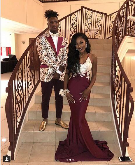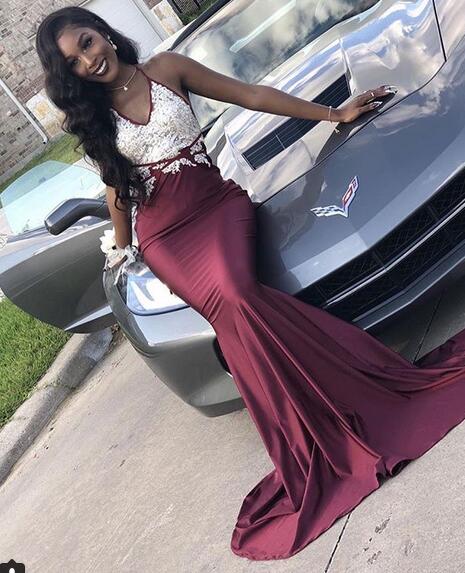 Sexy Burgundy Wine Red Mermaid Satin Prom Dresses White Appliques Lace African Girl Black Girl Evening Formal Party Gowns