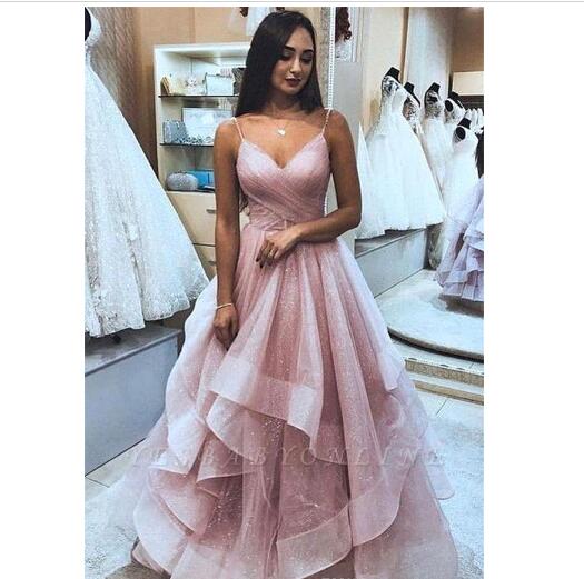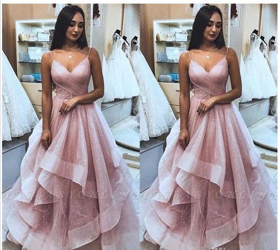 Glitz Pink Sequins Tulle Ruffles Prom Dresses Spahgetti Strap A Line Evening Gowns Long Formal Party Pageant Dress