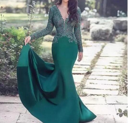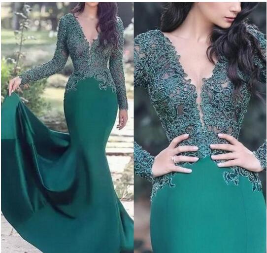 Green Muslim Prom Dresses V-neck Mermaid Long Sleeves Lace Islamic Dubai Saudi Arabic Elegant Long Formal Evening Gowns