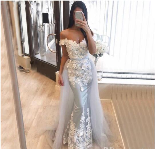 Latest Design Light Blue Handmade Flowers Prom Dresses Mermaid Off Shoulder Sexy Fashion Evening Gowns