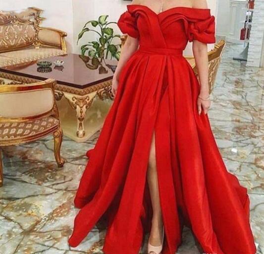 Red Ruffles Satin Long Prom Dresses 2020 New Off the shoulder Formal Party Gowns Sexy High side Split Celebrity Evening Dresses