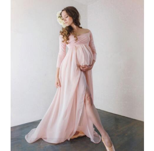 Attractive Chiffon Maternity Dresses For Photo Shoot With Long Sleeves Split Front Pregnant Gown Off The Shoulder Custom Made Maxi Dress