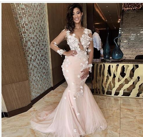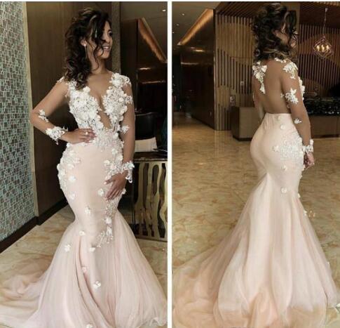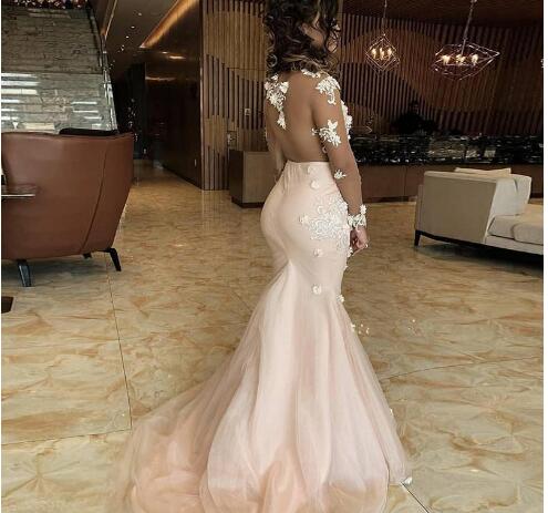 Sexy Mermaid Prom Dresses Sheer Neck Lace 3D Appliques Beaded Long Sleeves Sweep Train Backless Evening Party Wear Pageant Gowns