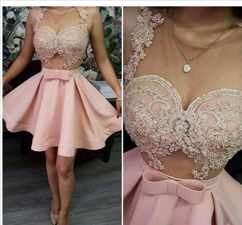 Pink Homecoming Dresses Sheer Neck Lace Appliques Short Prom Dress Sheer Neck See Through Cocktail Party Dress Cheap Gowns