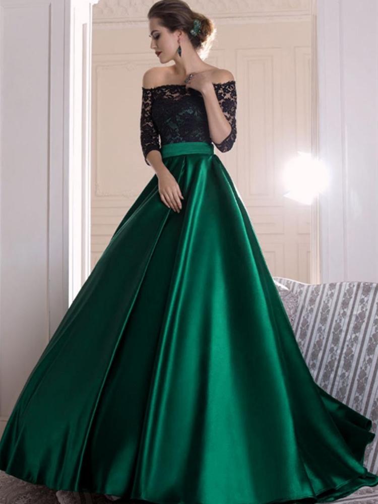 Black Lace Dark Green Satin Prom Party Dresses Off Shoulder 3/4 Long Sleeve A Line Floor Length Long Evening Gowns Formal Occasion