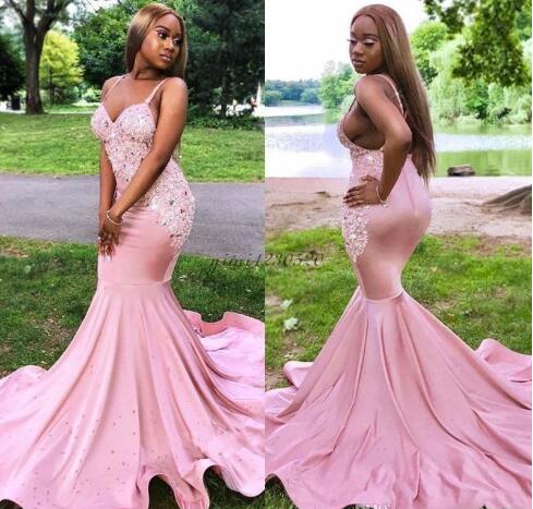 Pink Mermaid Prom Dresses Spaghetti Backless Sweep Train Crystal Beads Appliques Long Formal Evening Party Gowns Special Occasion Dress