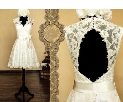 Vintage Style Short Lace Wedding Dresses Cap Sleeve Backless V-Neck Bow Sash Ivory Lace A-Line Classic Bridal Gowns Custom Made